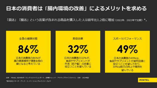 「日本においても『腸内環境の改善』によるメリットとして『全身の健康』『美容効果』『スポーツパフォーマンス』が求められていることが、ミンテルが日本で行った消費者調査の結果から分かります。日本の消費者の86%が腸の健康維持が健康全般の鍵となると考えており、32%が食品やサプリメントが外見(肌や髪)の改善に役立つことを望んでいます。また、日本の消費者の49%は、食品やサプリメントが疲労回復に役立つことを望んでおり、30%は筋力の向上や維持を望んでいました。」