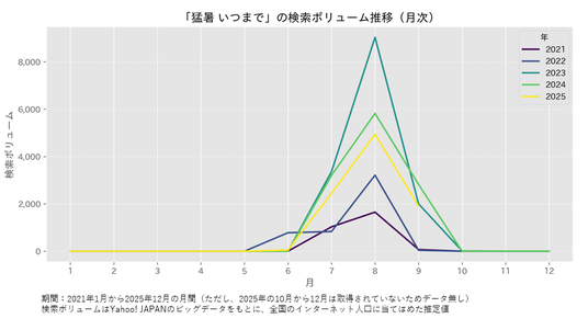 また、「猛暑 いつまで」といった暑さ関連の検索数も、2023年以降7月から9月にかけて高水準で推移しており、ユーザーが「暑い時期が長い」と感じている傾向が読み取れます。こうした環境変化が、涼しさや通気性を重視したサンダルの購買増加を後押ししている可能性が考えられます。