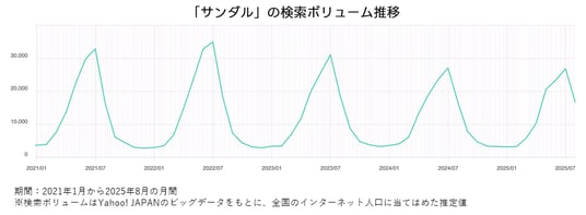 近年、猛暑日の増加などを背景に、夏の装いとしてサンダルを街中で目にする機会が増えています。もともと海やプールなど特定のシーンで履かれることが多かったサンダルが、どのようにして日常のファッションへ浸透したのか、「Yahoo!検索」の検索データおよび「Yahoo!ショッピング」の購買データなどをもとに分析しました。