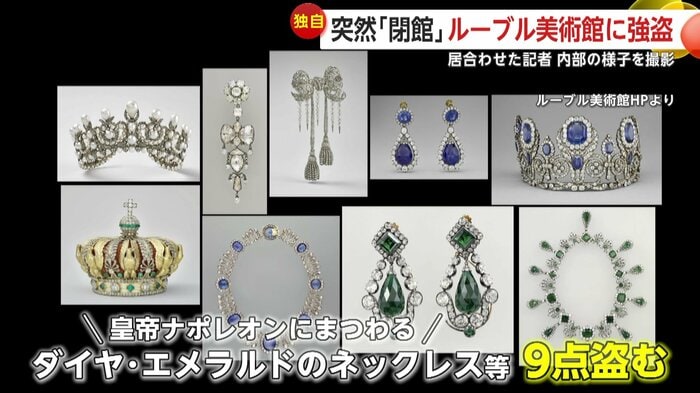 4人組の窃盗団がルーブル美術館から強奪したのは、皇帝ナポレオンにまつわるダイヤ・エメラルドをちりばめたネックレスなど9点で、犯行は、わずか数分で行われたという。