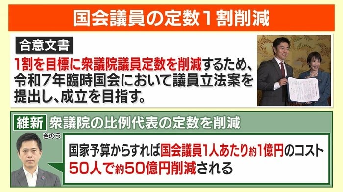 前回、17日の『サン!シャイン』出演以来話題となっているのが、「議員定数の削減」です。両党が交わした合意文書の中では、1割を目標に衆議院議員定数を削減するため、「令和7年臨時国会において議員立法案を提出し、成立を目指す」と明記。