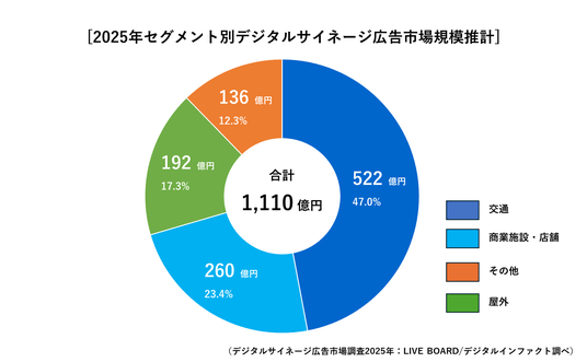 2025年のデジタルサイネージ広告市場規模は前年比116%、1,110億円と推測されます。交通は522億円で全体の47.0%、商業施設・店舗は260億円で全体の23.4%、屋外は192億円で全体の17.3%、そしてその他は136億円で全体の12.3%を占めると推測されます。