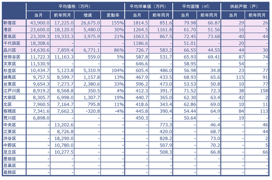 東京23区の各行政区毎に、平均価格、平均坪単価、平均面積、供給戸数をまとめました。当月の平均価格が大きい順に表示しています。