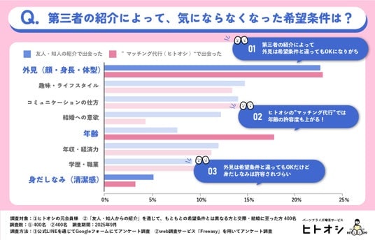 実際、調査ではヒトオシでの紹介を通じて交際・結婚に至った人の7割以上が「マッチングアプリで出会っていたら“いいね”を押さなかった」と回答しました。さらに「外見」や「年齢」といった、恋愛・婚活でこだわりがちな条件も、第三者の介在によって、自らの優先度を見直すことで、新たな出会いの可能性が広がることが分かりました。