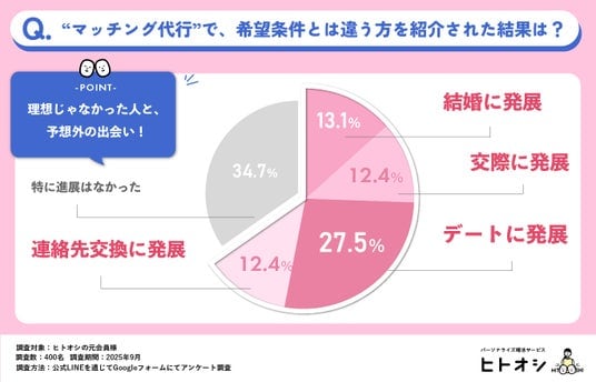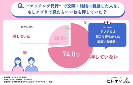 株式会社Parasol(本社:東京都港区、代表取締役:伊藤早紀)が運営するパーソナライズ婚活サービス「ヒトオシ」は、専門のプランナーが会員同士を引き合わせる婚活の“マッチング代行”サービスです。本リリースでは「ヒトオシ」の累計お見合い人数が10万人を突破したことを記念し、“マッチング代行(第三者が相手を選ぶ)”という新しい婚活スタイルの効果を調査した結果をお知らせいたします。その結果、利用者の70%以上が「自分では選ばないタイプ」と交際に発展していることが分かりました。