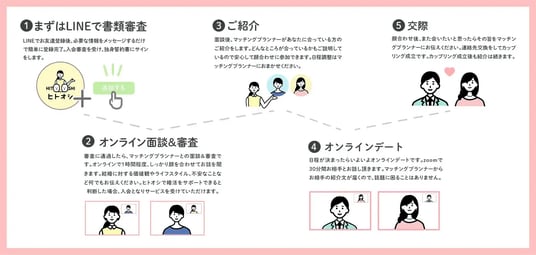 “マッチング代行”サービス「ヒトオシ」は、専門のマッチングプランナーが利用者の希望や価値観をもとに、毎月2名を厳選してご紹介し、オンラインでのお見合いを調整します。