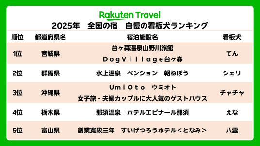 2025年「楽天トラベル 全国の宿 自慢の看板犬ランキング」トップ5