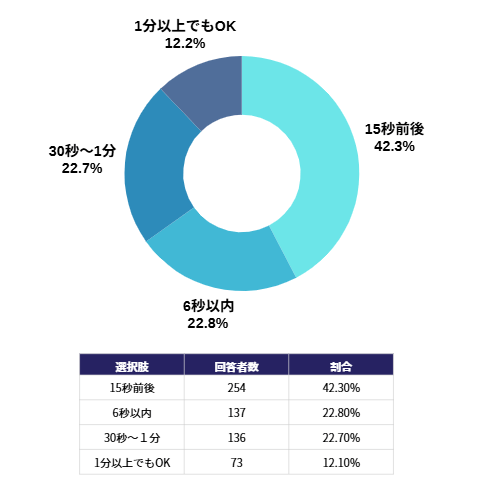 「 見てしまう広告はどのくらいの長さですか?」という設問に対し、Z世代の大学生の回答は以下の通りとなりました。