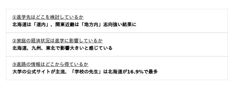 今回の調査は、「地域と進路選択」をテーマに、経済状況と情報の観点から分析を行いました。