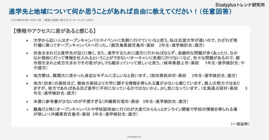 スタディプラス株式会社(本社:東京都千代田区、代表取締役:廣瀬高志、以下スタディプラス)のStudyplusトレンド研究所は、2025年8月8日(金)から8月13日(水)にかけて学習管理アプリ「Studyplus」上で全国の高校生を対象に「進路と地域に関するアンケート」を実施、1,703名から回答を得ましたのでご報告いたします。