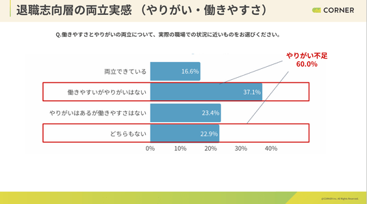 退職志向層の不満は処遇・昇進・裁量などやりがい側に偏っていたため、「働きやすさ」「やりがい」の両立実感を確認したところ、「両立できている」は16.6%にとどまる。「働きやすいがやりがいはない」「どちらもない」が60.0%のため、やりがい不足が浮き彫りになっている。
