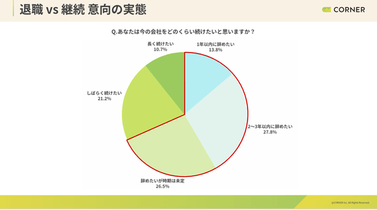 人事プロフェッショナルブティック「CORNER」を運営する株式会社コーナーは、入社1~3年目のZ世代(退職予定が決まっている人を除く)514名を対象に、「継続・退職意向」に関する調査を実施しました。(n=514、調査期間:2025年8月29日~9月4日)。本調査で、Z世代の68.1%が「いずれ辞めたい」と回答。今辞めない理由としては、転職活動の心理的・事務的負担と次のキャリアの不明確さが挙げられました。