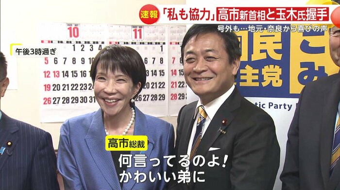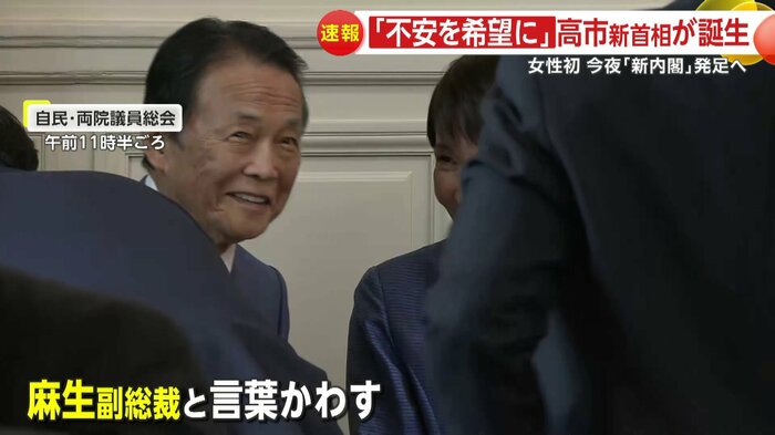 自民党の高市総裁は、総理指名選挙の直前に開かれた会合で、麻生副総裁と笑顔で言葉を交わした。