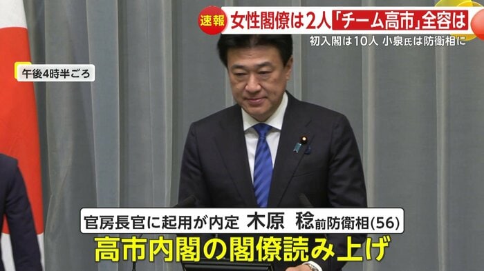 新たに官房長官に就任する木原稔前防衛大臣が、高市新内閣の閣僚名簿を読み上げた。