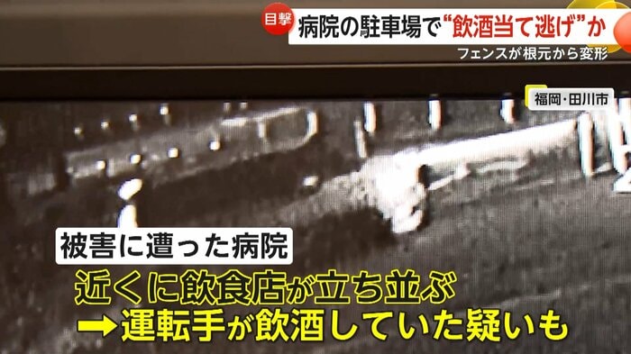 福岡・田川市の病院駐車場で9日、車がフェンスに衝突し、そのまま走り去る当て逃げ事故が発生した。防犯カメラにはウインカーを点滅させた車がフェンスにぶつかり、しばらく停車したのち、バックして逃走する様子が映っていた。病院側は、運転手が飲酒していた疑いもあるとして警察に相談している。