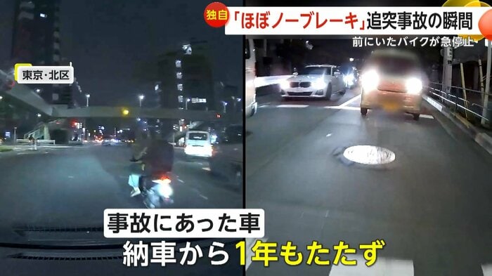 東京・北区の交差点で15日、バイクの急停止をきっかけに軽自動車が前方の車へ追突する事故が発生した。防犯カメラには、青信号が黄色に変わる瞬間にバイクが急停止し、慌ててブレーキを踏んだ前方車両に、後続の軽自動車が勢いよく突っ込む様子が映っていた。