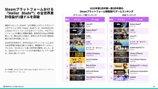 2025年9月末時点で、本作のSteamプラットフォームにおける全世界累計収益は1億ドルを超え、韓国産PCゲームのトップに立ち、93.6%という高い好評率を獲得しました。また、Steamプラットフォームでの中国市場のプレイヤー比率は、55%に達しています。