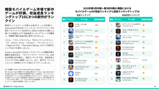 さらに、『マビノギモバイル』『RFオンラインネクスト』『I9: Inferno Nine』『Vampir』『キングショット』『Legend of Ymir』『God Goblin Raising』など7つの新作もトップ10入りを果たしました。