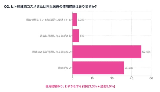 その結果、約7割の方が「ヒト幹細胞コスメ」や「再生医療」という言葉を認知している一方で、実際に使用経験がある方はわずか8%にとどまることが分かりました。