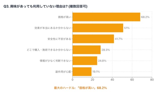 その結果、最も多かったのは「価格が高い」で約68%、次いで「効果が本当にあるか分からない」(51%)、「安全性に不安がある」(42%)という結果になり、価格面でのハードルが最も高いことが明らかになりました。