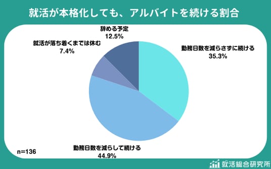 一方で、「就活が落ち着くまでは休む」(7.4%)、「辞める予定」(12.5%)と回答した就活生はあわせて19.9%にとどまり、多くの学生が就活とアルバイトを両立させることを前提としていることが明らかになりました。