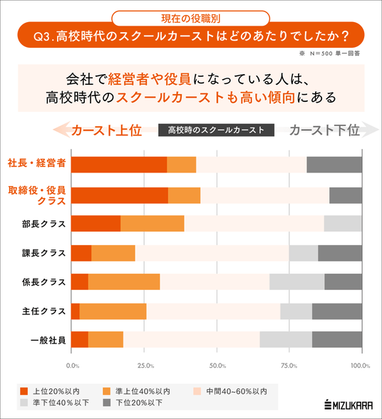 高校時代に「イケてる集団」に属していた=高エフィカシー(自己効力感)層は、その後社会に出たら実際に活躍するのでしょうか?そこで現在の会社における役職の相関を分析してみました。結果、会社で経営者や役員になっている人は、高校時代のスクールカーストも高く「高校のスクールカーストが実社会の縮図」になっているともいえそうです。