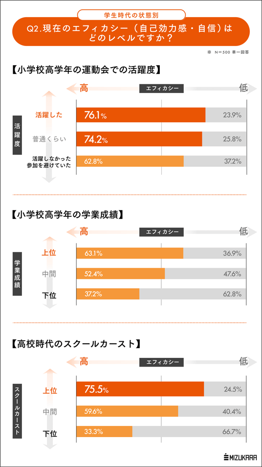 認知科学に基づくコーチングを法人・個人に提供する株式会社ミズカラ(本社:東京都千代田区、代表取締役 山宮健太朗)は、このたび25歳~59歳の働く男女500名を対象とした「運動会の活躍度合いと現在のエフィカシーの相関」に関する意識・実態調査を行いました。