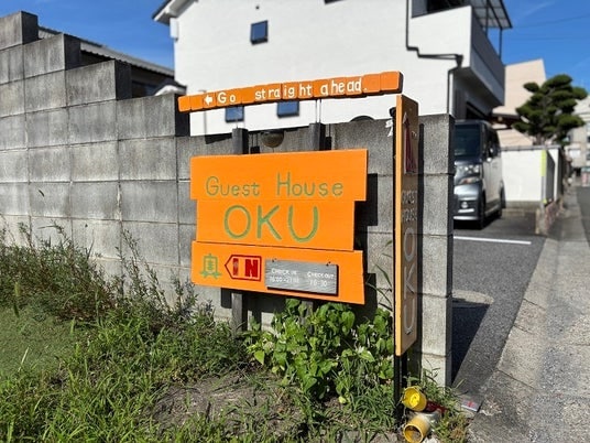 GUEST HOUSE OKUの看板。ゲストハウスはこの先の通路の「奥」に位置しています