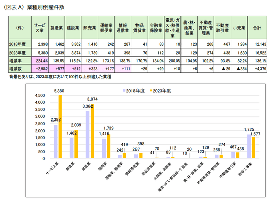 中でも「サービス業」は2,982件の増加となっており、増加率とともに突出して増加していることがわかります。これに続いて、「製造業」と「建設業」では、500件を超える倒産件数となっています。(図表A)