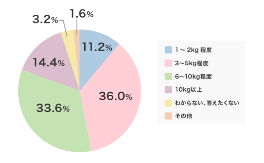3キロ以上増えた方が85%に達し、そのうち6キロ以上が48%、さらに10キロ以上という回答が14.4%になりました。