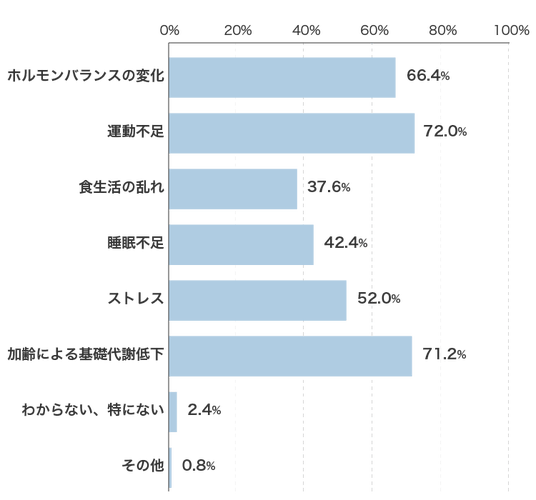 更年期の直接的な影響と思われる「ホルモンバランスの変化」という回答も7割近くになりました。