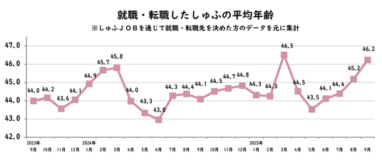 転職しゅふの平均年齢は、前月比+1.0歳、前年同月比+2.1歳の46.2歳となりました。