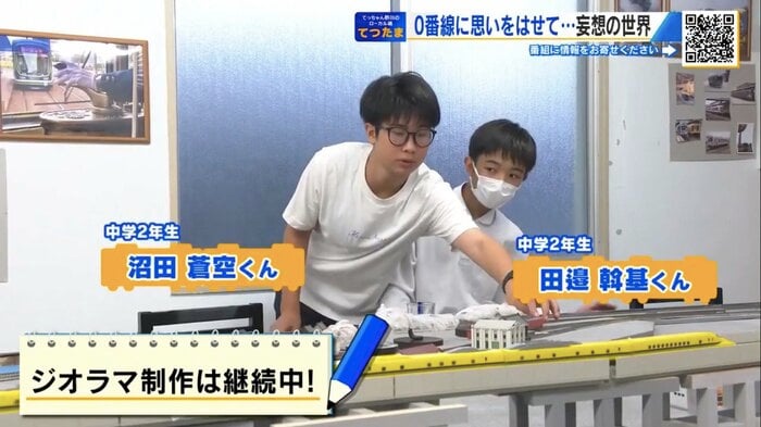 ジオラマ制作を手伝う中学生も筋金入りだ。中学2年生の田邉幹基くんは227系レッドウィングの模型を広電カラーに塗り替え、グリーンムーバーマックス仕様に改造していた。これには鉄道ファンの野川キャスターも思わず脱帽。