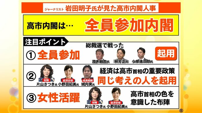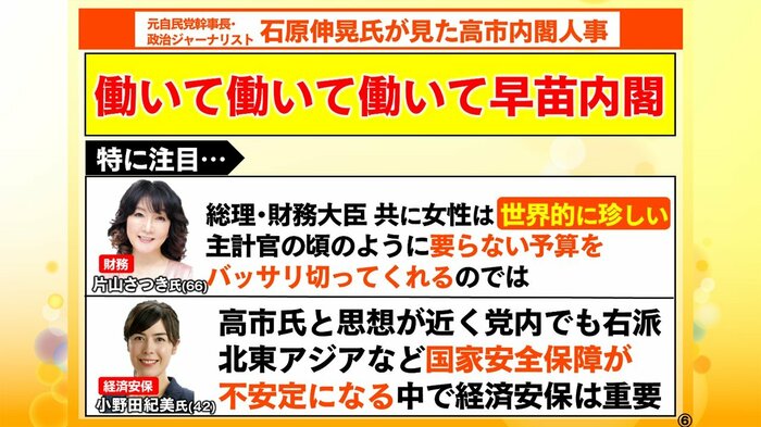 (注目は)片山さんと小野田さん。思想信条が総理に非常に近い人たちを重要なポストで抱えた、女性閣僚は小泉内閣に5人いたのですが、あのときは川口さんとか外の方を連れてきて5人になったと。政界は女性の参加率が低いですが、そんなになかなか高市新総理が「あなたに!」という人もたくさんいない中で、今回の布陣になっている。