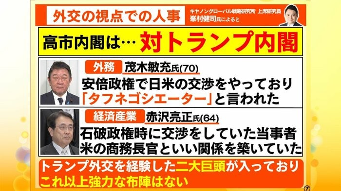 赤沢さんが横滑りをして経済産業大臣になっている、経済外交は経産省と外務省の二輪でやるんです。このコンビネーションが非常に重要になってくるので、なかなか良い布陣だと思います。