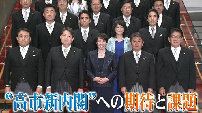 各政党への挨拶回りを終えた後、皇居にて新総理の親任式と新閣僚の認証式を経て発足した“高市内閣”。女性閣僚2人、初入閣10人、平均年齢59.3歳という目新しい顔ぶれとなりました。