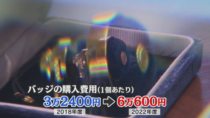県議会事務局によると、本章の購入費は、2018年度に1個3万2400円だったが、2022年度には、1個6万6000円と4年で2倍以上も値上がりしているという。今回、2027年に予定されている県議会議員選挙に向け、2026年度に購入した場合の参考見積もりをとったところ、議員バッジの予備や略章を含めると、総額で3000万円を超えることが分かった。