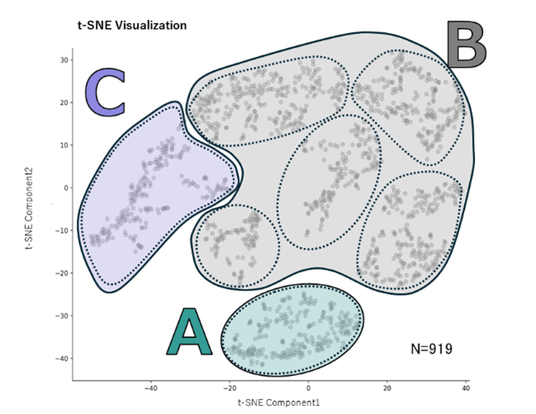 Walk Coordinator技術を搭載したアプリを使うと、わずか8歩の歩行から骨盤角度・関節角度・関節モーメントの左右差や可動性などを測定できます。このアプリを用いて、2023年に919人のデータを取得し*3、歩行時の身体アライメントの非対称性に関する52項目を機械学習で整理。身体アライメントのゆがみの程度で分類したマップを作成しました*4。このマップは、52項目から計算された一人ひとりの身体アライメントのゆがみ特徴に基づいてプロットしており、位置関係が近いほど特徴が似ていることを示しています(図1)。その結果、歩行に現れる身体アライメントの特徴は、類似度によって7つの小さなグループに分類でき、さらにそこから3つの大きなタイプに集約できることが判明。Cタイプは多くの項目でゆがみが認められた一方で、AタイプはCタイプに比べてゆがみが少なく、相対的に良好な身体アライメントを保持していると考えられました。また、AとCの中間にあたるのがBタイプとして示されました。
