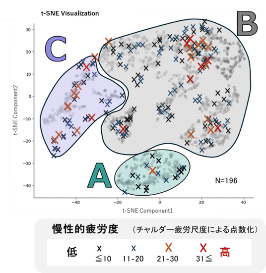 2024年に実施した歩行測定によって196名をA~Cタイプのいずれかに分類し、チャルダー疲労尺度で評価した慢性的疲労度のスコアと併せて図1に重ねてプロットしました*5(図2)。その結果、身体アライメントのゆがみが比較的良好なAタイプでは、疲労度の高い人はほとんど見られませんでしたが、対照的にCタイプでは疲労度の高い人が多く確認されました。以上のことから、身体アライメントのゆがみが慢性的疲労と密接に関連していることが示唆されます。