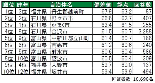 ●トップ20内で今回初登場の自治体は19位の福井県南条郡南越前町で、昨年は累計回答者数が50名未満でランキングの集計対象外でした。その他、昨年ランク外で今回ランクインしたのは、20位の石川県河北郡内灘町です(昨年は偏差値50未満のため順位非公開)。