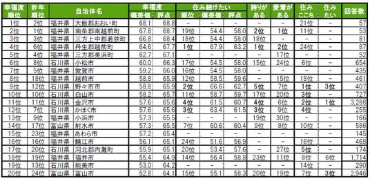 街の幸福度1位は福井県大飯郡おおい町、2位福井県南条郡南越前町。3位は2年連続で福井県三方上中郡若狭町。