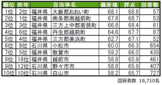 1位は福井県大飯郡おおい町、2位は福井県南条郡南越前町です。3位は、2年連続で福井県三方上中郡若狭町です。トップ10内では、8位の福井県越前市が、昨年18位から順位を上げてトップ10入りしています。トップ5は、全て福井県の郡部に属する「町」という結果になっています。