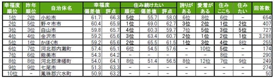 街の幸福度は、1位小松市、2位野々市市。3位は2年連続で白山市。
