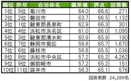 駿東郡清水町が、2年連続で1位に輝きました。2位は昨年3位から一つ順位を上げた静岡市葵区、3位は周智郡森町です。