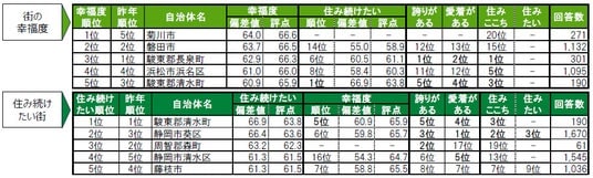 街の幸福度の1位は菊川市。2位は2年連続で磐田市。3位駿東郡長泉町。