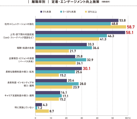 一方、離職率が10%以上の企業では「社内コミュニケーションの強化」(58.7%)に偏っており、「報酬・処遇の改善」や「柔軟な勤務制度の導入・拡充」が相対的に低い傾向が見られました。対話に加えて制度面の対応も重要なポイントとなりそうです。