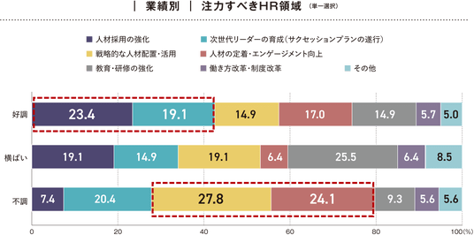 (1) 業績状況によって「注力すべきHR戦略領域」が大きく異なる結果に。業績が不調な企業では「戦略的な人材配置・活用」や「人材の定着・エンゲージメント向上」、業績が好調な企業では「人材採用の強化」や「次世代リーダーの育成」が重視されています。