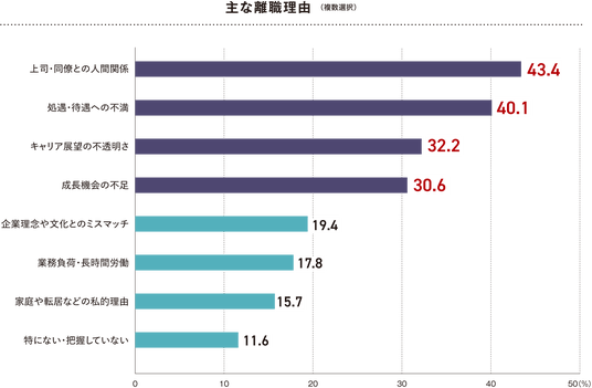 (7)離職理由の上位は「人間関係」「処遇・待遇への不満」、将来性や自己実現も重視。