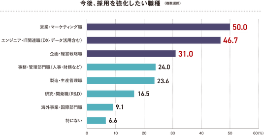 今後採用を強化したい職種としては、「営業・マーケティング職」(50.0%)が最多となり、次いで「エンジニア・IT関連職(DX・データ活用含む)」(46.7%)が高い割合を示しました。また、「企画・経営戦略職」(31.0%)も3割を超えております。一方、「事務・管理部門職」や「製造・生産管理職」は2割台にとどまっていることから、フロント機能や成長ドライバーとなる職種への重点採用が進められていることがうかがえます。