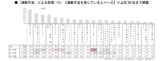 - 「運動不足」による影響は「筋力の低下」(65%)「体重の増減」(48%)など、肉体面に関するスコアが高い。「便秘・下痢」「気分の落ち込み」は40-54歳で高く、55歳以上では低い。